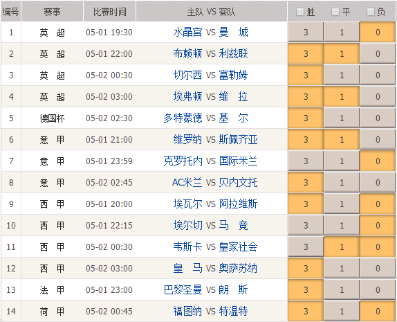 046期足彩头奖开出728注,单注奖金47618元。本期胜负彩14场赛事主要由5大联赛场次组成,其中英超、西甲各4场占比最大,此外还有意甲3场,法甲、荷甲、德国杯各有1场。下面我们就本期的足彩比赛做出分析。