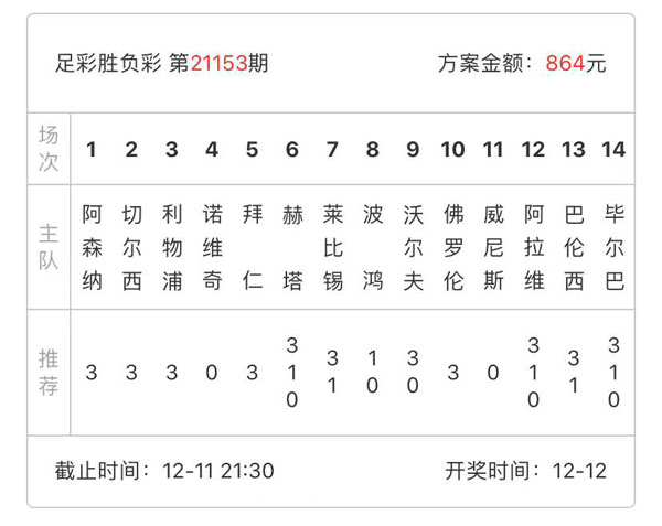 胜负彩第21153期竞猜对象为英超、德甲、意甲和西甲四大联赛,周中欧战小组赛结束后,参加欧冠的五大联赛球队仅有AC米兰和沃尔夫斯堡排名榜尾直接出局。无论欧战晋级与否,圣诞前各路球队都会重心联赛打拼,但国内杯赛和补赛在周中会有所加塞。