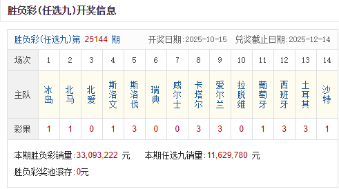 本期足彩销量33,093,222元,本期任选九销量11,629,780元,开奖结束后,足彩奖池滚存0元。