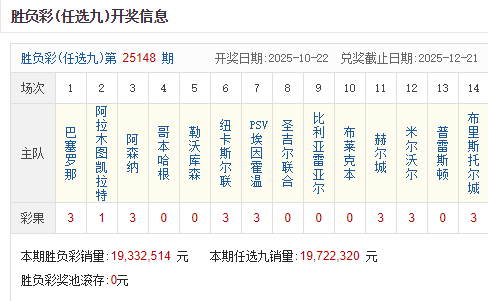 本期足彩销量19,332,514元,本期任选九销量19,722,320元,开奖结束后,足彩奖池滚存0元。