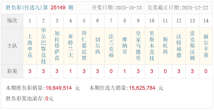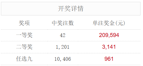 北京时间10月23日,足彩25149期开奖。本期全国中出一等奖42注,每注奖金209594元,二等奖中出1201注,每注奖金3141元。另外,任选9场中出10406注,每注奖金961元。