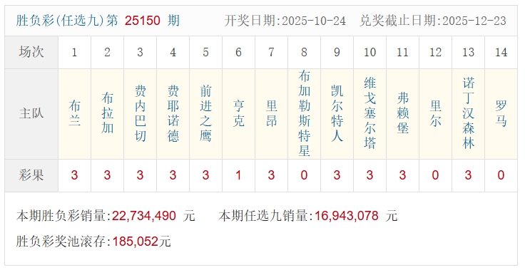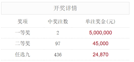 北京时间10月24日,足彩25150期开奖。本期全国中出一等奖2注,每注奖金5,000,000元,二等奖中出97注,每注奖金45,000元。另外,任选9场中出436注,每注奖金24,870元。