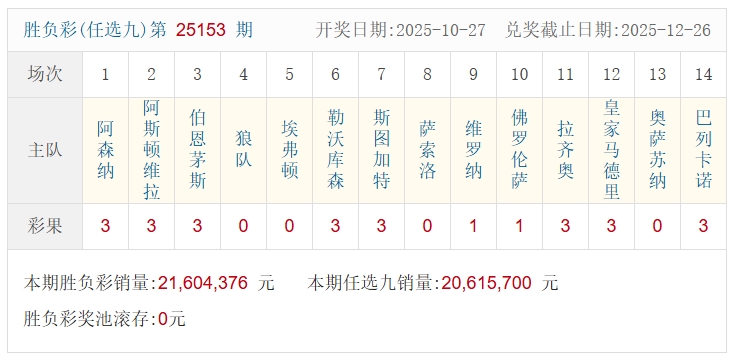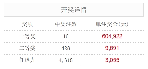 北京时间10月27日,足彩25153期开奖。本期全国中出一等奖16注,每注奖金604,922元,二等奖中出428注,每注奖金9,691元。另外,任选9场中出4,318注,每注奖金3,055元。