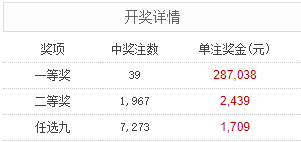 北京时间10月30日,足彩25155期开奖。本期全国中出一等奖39注,每注奖金287,038元,二等奖中出1967注,每注奖金2,439元。另外,任选9场中出7273注,每注奖金1,709元。