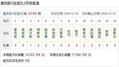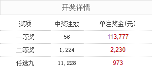 北京时间11月1日,足彩25156期开奖。本期全国中出一等奖56注,每注奖金113,777元,二等奖中出1224注,每注奖金2,230元。另外,任选9场中出11228注,每注奖金973元。