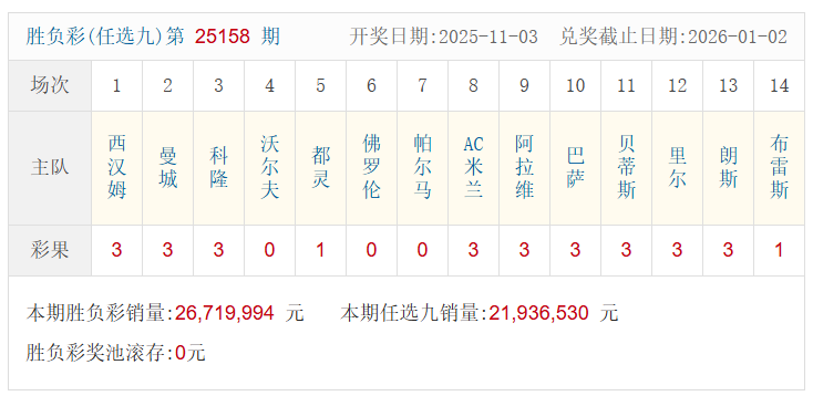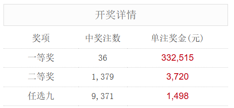 北京时间11月3日,足彩25158期开奖。本期全国中出一等奖36注,每注奖金332,515元,二等奖中出1,379注,每注奖金3,720元。另外,任选9场中出9,371注,每注奖金1,498元。