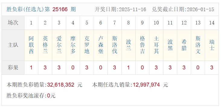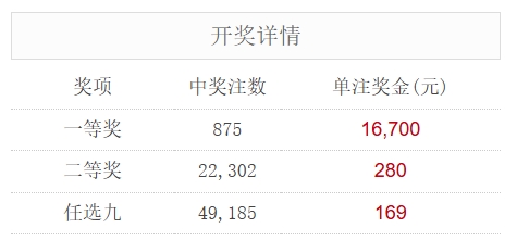北京时间11月16日,足彩25166期开奖。本期全国中出一等奖875注,每注奖金16,700元,二等奖中出22,302注,每注奖金280元。另外,任选9场中出49,185注,每注奖金169元。
