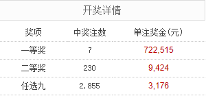 北京时间11月22日,足彩25168期开奖。本期全国中出一等奖7注,每注奖金722,515元,二等奖中出230注,每注奖金9,424元。另外,任选9场中出2855注,每注奖金3,176元。
