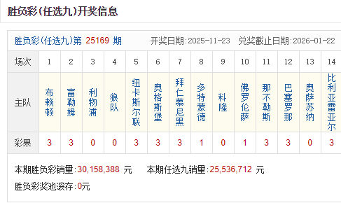 北京时间11月23日,足彩25169期开奖。本期全国中出一等奖20注,每注奖金675,547元,二等奖中出685注,每注奖金8,453元。另外,任选9场中出3785注,每注奖金4,317元。