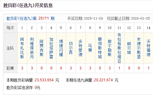 北京时间11月26日,足彩25171期开奖。本期全国中出一等奖11注,每注奖金958,461元,二等奖中出392注,每注奖金11,526元。另外,任选9场中出1558注,每注奖金8,306元。