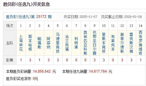 北京时间11月27日,足彩25172期开奖。本期全国中出一等奖11注,每注奖金605,070元,二等奖中出453注,每注奖金6,296元。另外,任选9场中出3888注,每注奖金2,406元。