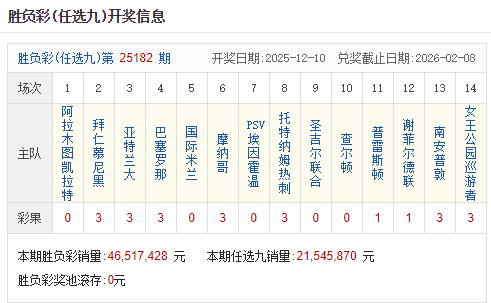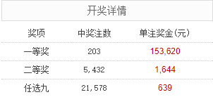 北京时间12月10日,足彩25182期开奖。本期全国中出一等奖203注,每注奖金153,620元,二等奖中出5432注,每注奖金1,644元。另外,任选9场中出21578注,每注奖金639元。