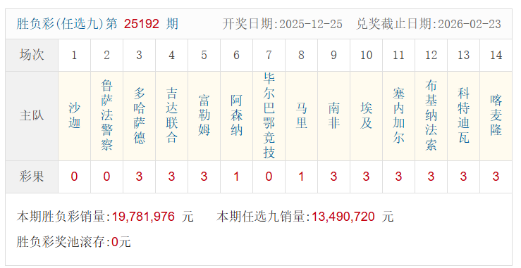 北京时间12月25日,足彩25192期开奖。本期全国中出一等奖411注,每注奖金21,562元,二等奖中出8,396注,每注奖金452元。另外,任选9场中出44,142注,每注奖金195元。