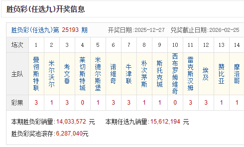 本期足彩销量14,033,572元,本期任选九销量15,612,194元,开奖结束后,足彩奖池滚存6,287,040元。