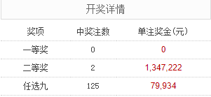 北京时间12月27日,足彩25193期开奖。本期全国未中出一等奖,其中二等奖中出2注,每注奖金1,347,222元。另外,任选9场中出125注,每注奖金79,934元。