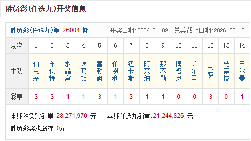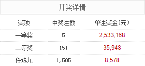 北京时间1月9日,足彩26004期开奖。本期全国中出一等奖5注,每注奖金2,533,168元,二等奖中出151注,每注奖金35,948元。另外,任选9场中出1585注,每注奖金8,578元。