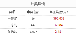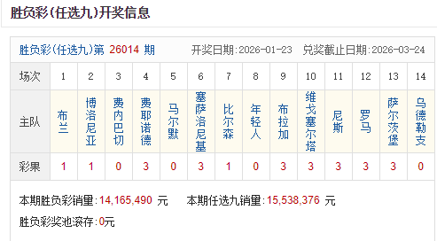 北京时间1月23日,足彩26014期开奖。本期全国中出一等奖16注,每注奖金396,633元,二等奖中出447注,每注奖金6,084元。另外,任选9场中出4007注,每注奖金2,481元。
