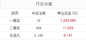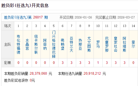 北京时间1月26日,足彩26017期开奖。本期全国中出一等奖15注,每注奖金1,284,090元,二等奖中出494注,每注奖金11,029元。另外,任选9场中出2180注,每注奖金6,141元。
