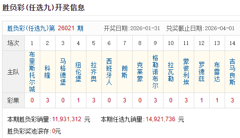 本期足彩销量11,931,312元,本期任选九销量14,921,736元,开奖结束后,足彩奖池滚存0元。