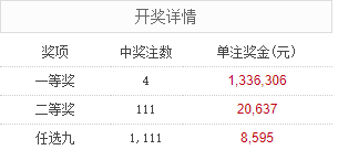 北京时间1月31日,足彩26021期开奖。本期全国中出一等奖4注,每注奖金1,336,306元,二等奖中出111注,每注奖金20,637元。另外,任选9场中出1,111注,每注奖金8,595元。
