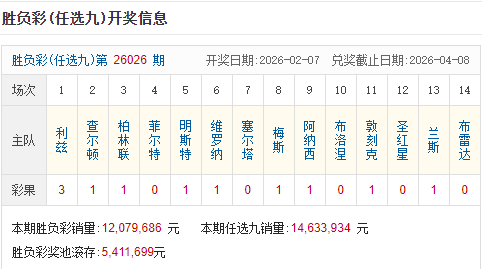本期足彩销量12,079,686元,本期任选九销量14,633,934元,开奖结束后,足彩奖池滚存5,411,699元。