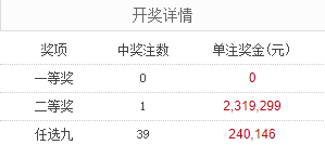 北京时间2月7日,足彩26026期开奖。本期全国中出一等奖0注,每注奖金0元,二等奖中出1注,每注奖金2,319,299元。另外,任选9场中出39注,每注奖金240,146元。