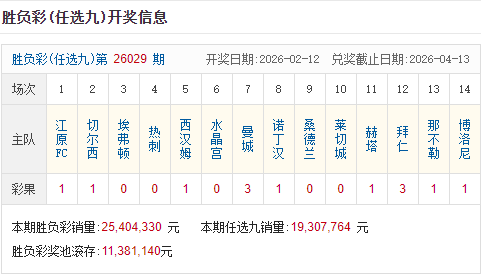本期足彩销量25,404,330元,本期任选九销量19,307,764元,开奖结束后,足彩奖池滚存11,381,140元。