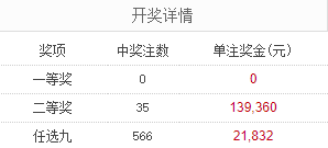 北京时间2月12日,足彩26029期开奖。本期全国一等奖未开出,二等奖中出35注,每注奖金139,360元。另外,任选9场中出566注,每注奖金21,832元。