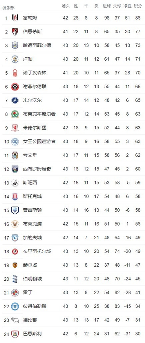 本场结束后,少赛1场的富勒姆以42场86分高居榜首,少赛2场伯恩茅斯41场77分排名第二。