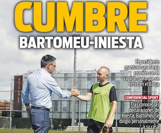 《每日体育报》今天的头版头条,正是巴萨主席和队长的这次会面。该报指出,巴萨两大巨头当面就续约问题进行了交谈。在大方向上,双方保持一致。巴萨希望伊涅斯塔能在诺坎普退役,俱乐部将会为他递交一份每年自动续约的无限期合同。伊涅斯塔也表示,自己愿意留在诺坎普。