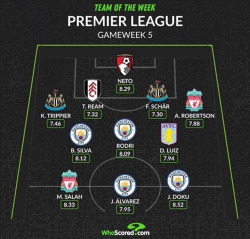 9月19日讯 本轮英超已经全部结束,利物浦、曼城均以3-1逆转取胜,阿森纳收获一球小胜,以下为数据网站Whoscored评选出的本轮英超最佳阵容: