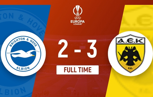 03:00,欧联杯小组赛B组第1轮,布莱顿主场对阵雅典AEK。上半场,西迪贝精彩头槌破门,若昂-佩德罗造点+点射扳平,打进布莱顿队史欧战首球,加西诺维奇破门;下半场,若昂-佩德罗再次造点,点射双响再次扳平,尾声阶段庞塞破门帮助雅典AEK第三次领先,下半场补时13分钟,最终布莱顿2-3不敌雅典AEK,海鸥欧战首秀憾负。