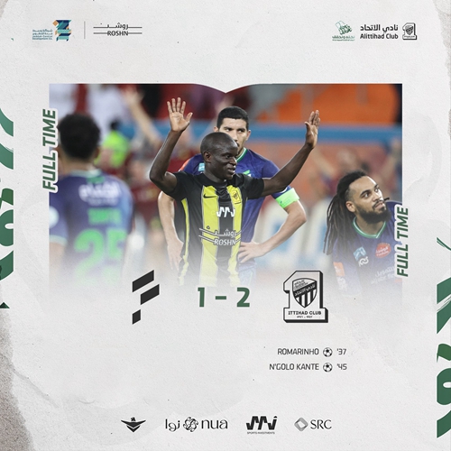 沙特联第七轮,吉达联合主场迎战哈萨征服。第17分钟哈达内为哈萨征服拔头筹,第38分钟,坎特一条龙助攻罗马里尼奥破门扳平。半场补时,坎特世界波完成传射。比赛最终吉达联合2-1逆转哈萨征服,两连胜登顶。