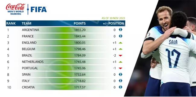11月30日讯 FIFA年终排名:阿根廷仍居世界第一,法国、英格兰二三。
