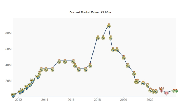 18年10月的时候,效力皇马的伊斯科还是9000万欧的身价,五年来,球员身价一直下跌,直到500万欧的身价时无球可踢。去年夏天伊斯科曾极其接近加盟德甲球队柏林联合,但最终交易告吹。今夏去到贝蒂斯的他,表现亮眼焕发新生,各项赛事出场23场,打入3球并有4次助攻,多次获选全场最佳,身价也稍有回调至800万欧。
