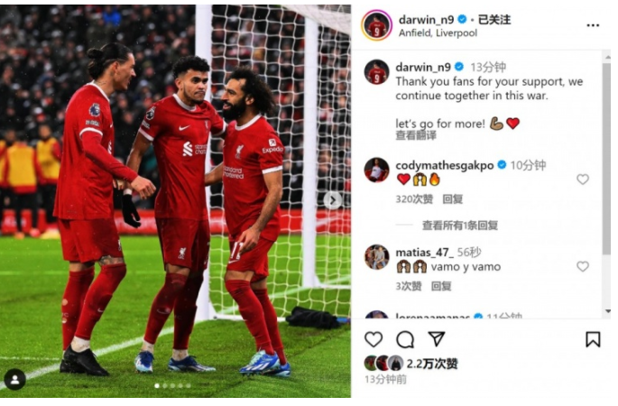 赛后努涅斯在社交媒体上晒出庆祝的照片,并写道:“感谢球迷的支持,我们继续并肩作战。让我们再接再厉!”