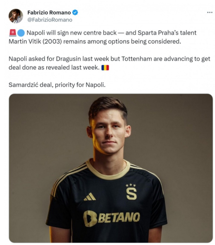 罗马诺指出,那不勒斯将在冬窗引进中卫,他们考虑从布拉格斯巴达签下20岁捷克国脚维蒂克。那不勒斯上周曾询问热那亚中卫德拉古辛的情况,但热刺正在推进转会交易。