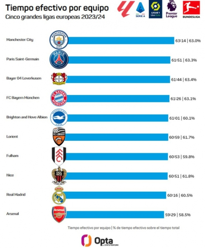 1月2日讯 据OptaJose数据统计,曼城本赛季平均有效比赛时长63分14秒,是五大联赛平均有效比赛时长最长的球队,皇马平均有效比赛时长60分16秒,是榜单前十中唯一的西甲球队,意甲没有球队上榜。