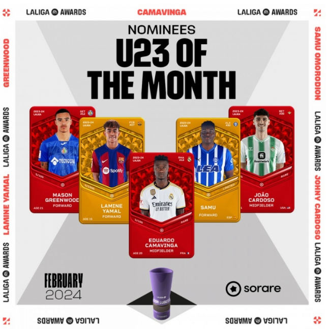 西甲官方公布了2月份最佳U23球员候选名单,格林伍德、亚马尔、卡马文加在列。