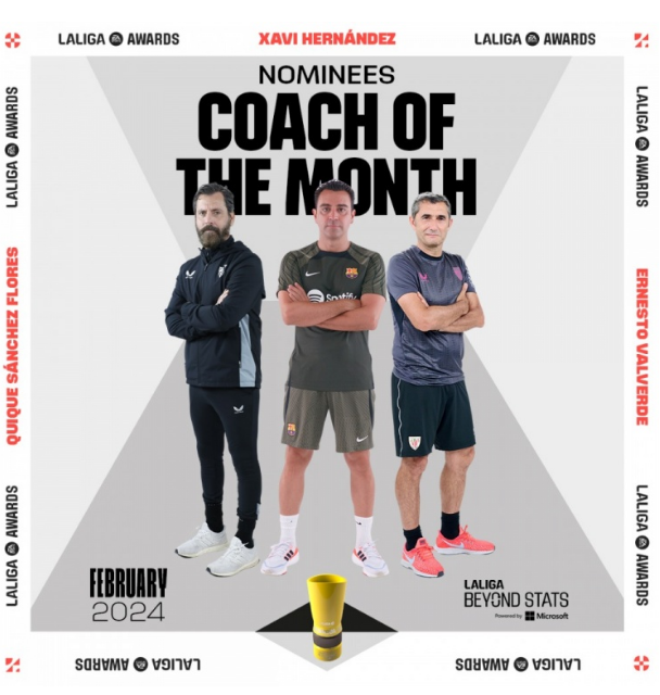 西甲官方公布了2月份最佳主帅的候选名单,哈维、弗洛雷斯、巴尔韦德在列。