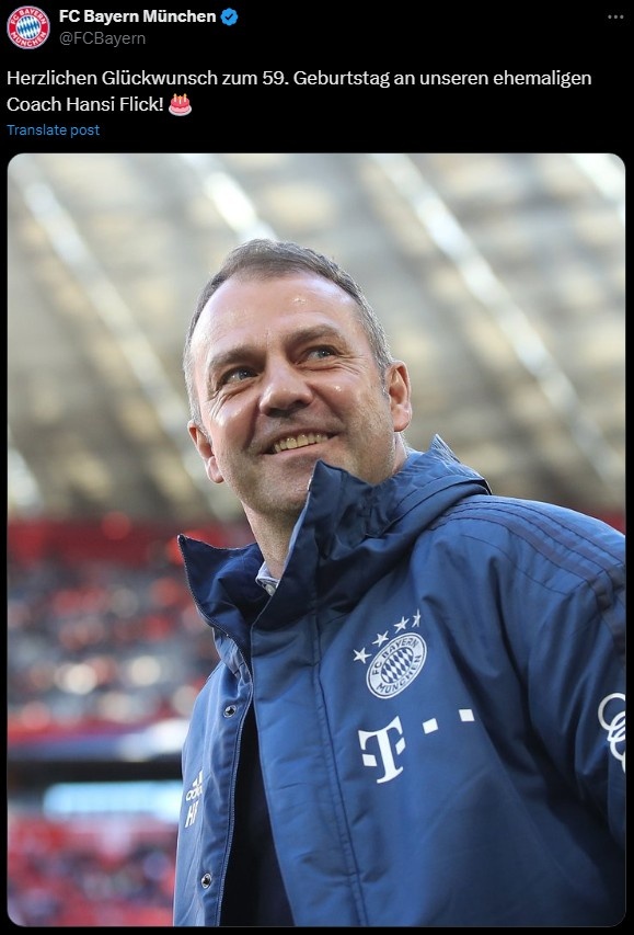 有消息称,弗里克可能在今夏回归拜仁,而今天拜仁官推也发文祝福前主帅,写道:“祝我们的前教练汉斯-弗里克59岁生日快乐。”