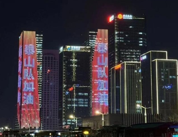 今天泰山队主场对阵横滨水手的比赛进行期间,济南市的高楼亮灯,为泰山队加油助威。