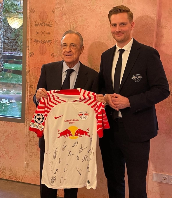 本周,莱比锡前往客场挑战皇马。赛前双方高层聚在一起享用午餐,期间莱比锡总经理普伦格向皇马主席弗洛伦蒂诺赠送了莱比锡签名球衣作为礼物,并且进行了合影。