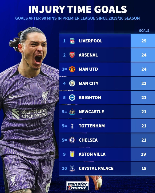3月7日讯 据德转统计,自2019-20赛季以来,利物浦在联赛90分钟后一共打进了29球,排名英超第一,排名第二的是阿森纳和曼联的24球。