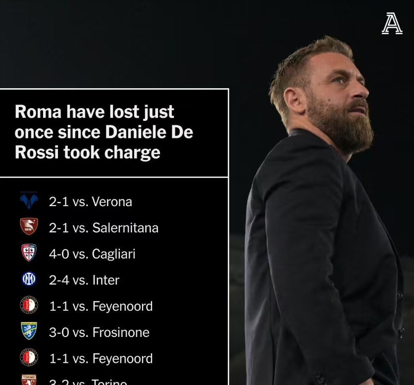 德罗西接手罗马帅位以来,球队战绩为7胜2平1负,仅输给联赛领头羊国米。