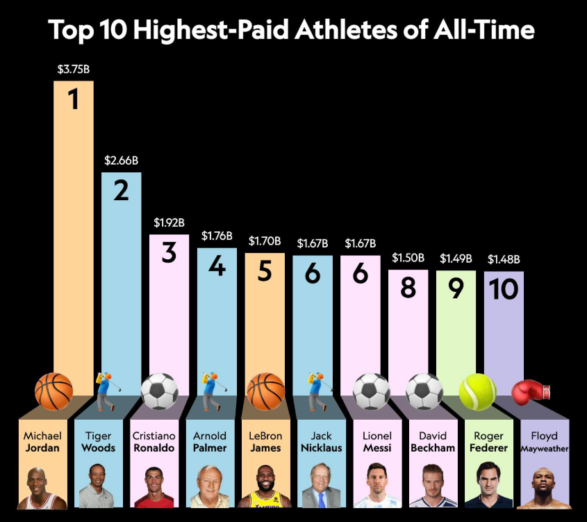 03月07日讯 体育商业数据统计网站sportico统计了历史收入最高运动员榜,收入最高的是乔丹,足球有3人入围。