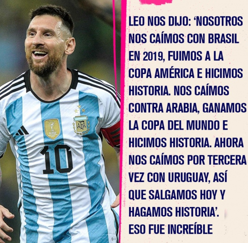 “现在,我们第三次输给了乌拉圭。所以,今天我们就全力以赴来创造历史吧。”