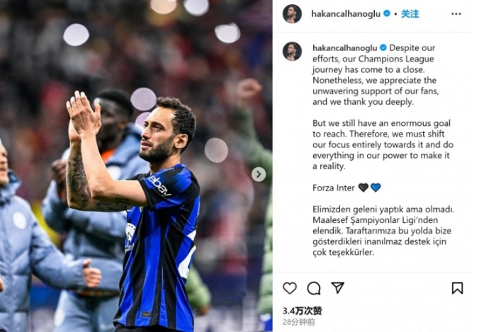 欧冠1/8决赛,国米点球大战中不敌马竞,止步16强。赛后,恰尔汗奥卢更新了社媒,感谢了内拉一如既往的支持。
