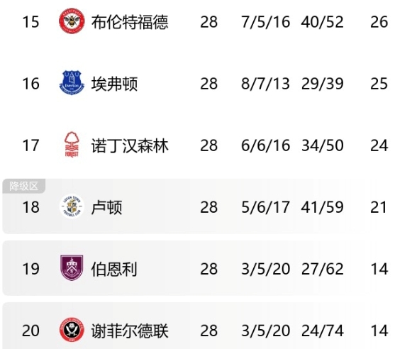 积分榜上,卢顿、伯恩利、谢菲尔德联三队分列倒数第三、二、一,他们也正是本赛季英超的升班马。