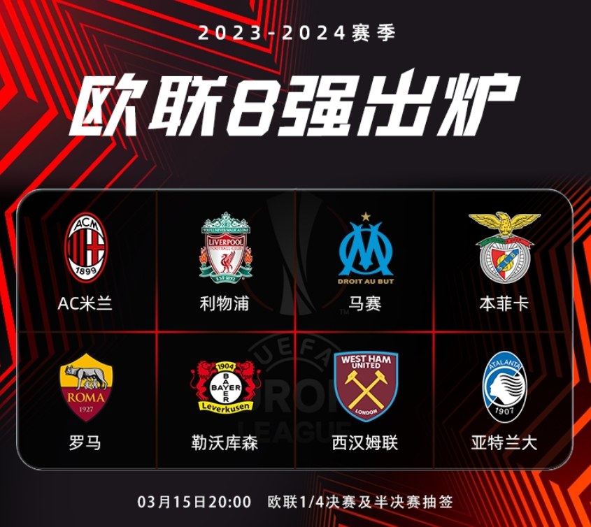 欧联1/4决赛及半决赛抽签将于北京时间3月15日20:00进行,抽签不设种子队和同国球队回避原则。